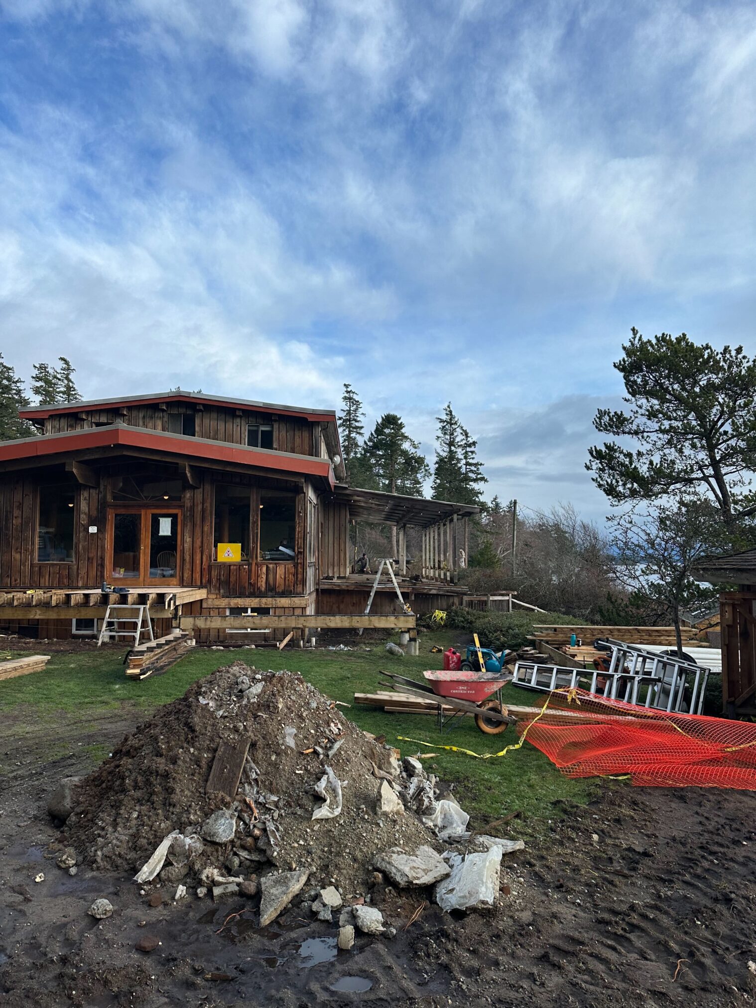 This renovation project is the largest capital project we have done at Hollyhock in more than 20 years. It represents the first project of our Campus Planning project completed in 2021 – which is a plan to revitalize the Hollyhock Campus for the next 20 – 40 years. Over the life of Hollyhock, capital projects have been a challenge to execute for many reasons. Our beautiful Campus is in the heart of a rain-forest where the ocean meets the forest. In the winter, south-east winds roar up the Salish Sea and rains batter our hand-built buildings and soak the lands. Finding contractors to work in the winter is tough and finding the money to finance the work, even harder.