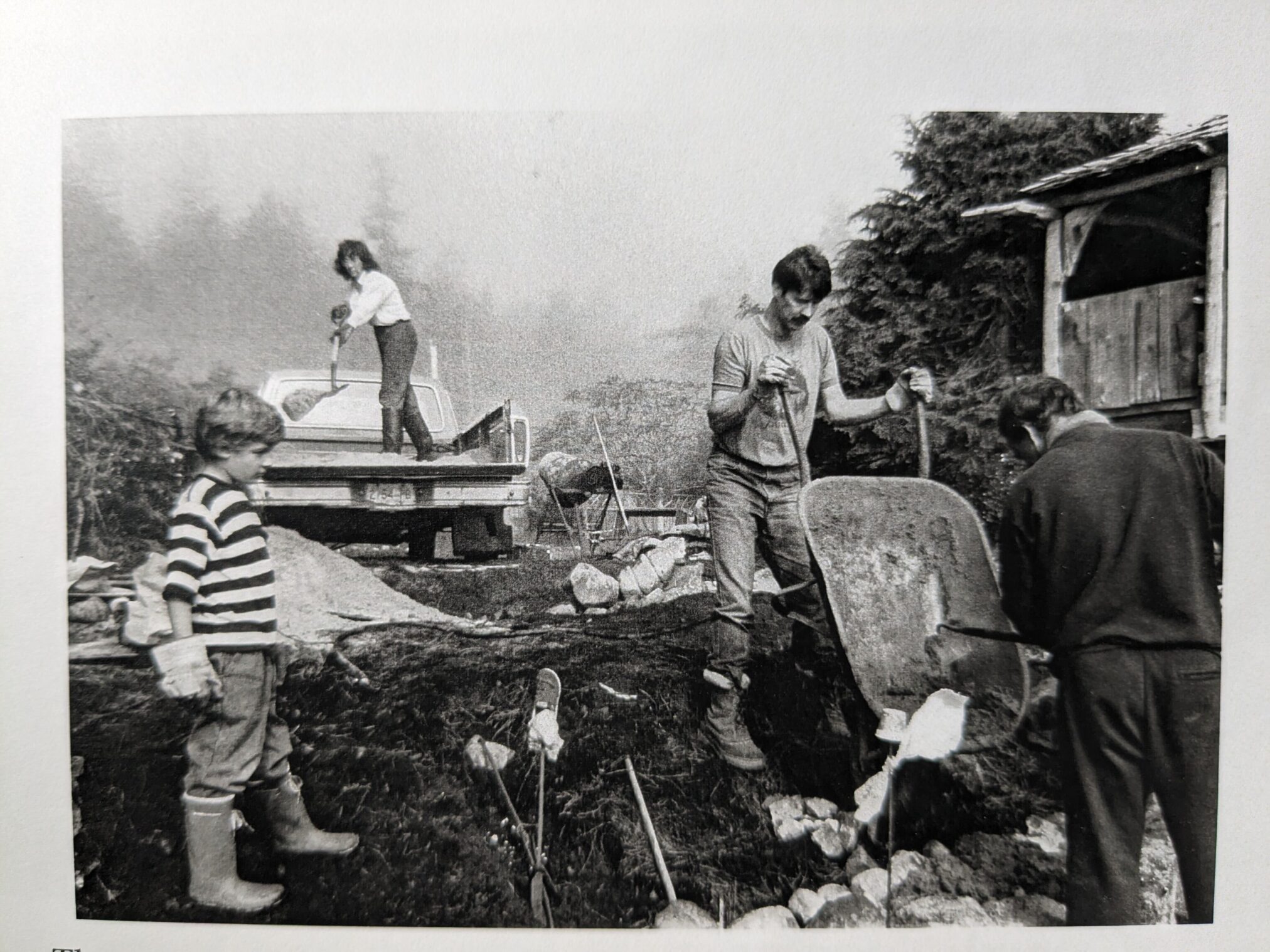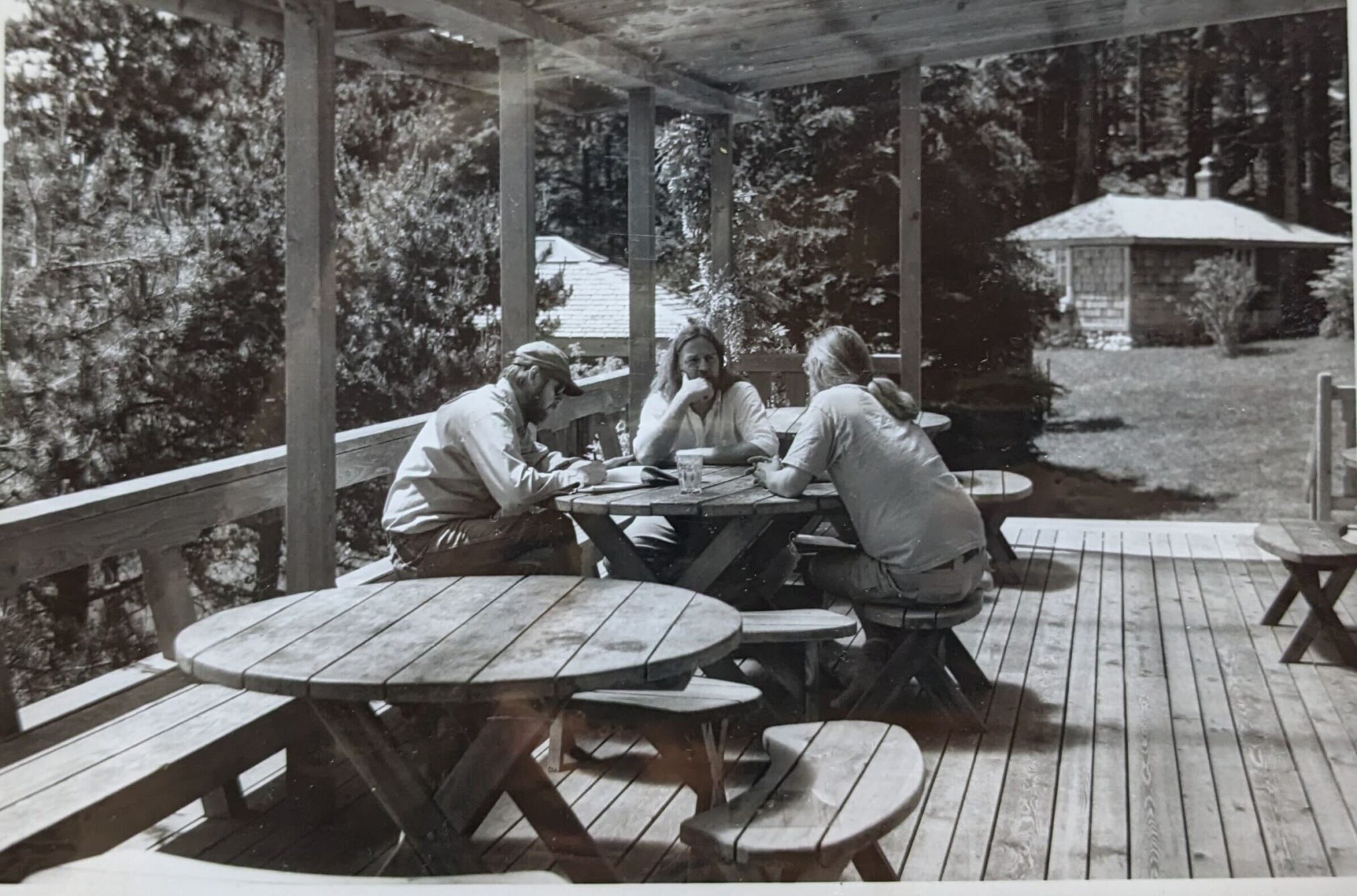 Photos of Hollyhock from the archives: Hollyhock Lodge (1980s) | The original hot tub build (1980s) | Lodge deck (1990s) | early Annual General Meeting (1980s)