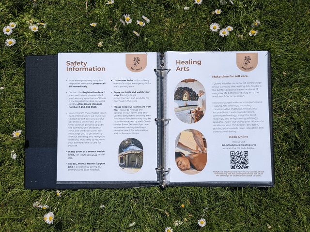 Each guidebook is specially curated, encompassing all the details for you to successfully navigate your stay at Hollyhock. This includes historical information, dining, safety, guest activities, hours, directions, and so much more!