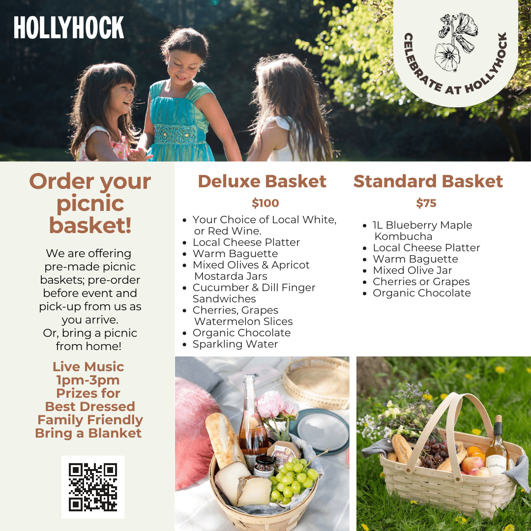 We’re offering pre-made picnic baskets! Pre-order before the event and pick up on arrival, or feel free to bring your own picnic from home. To order your picnic basket, call 1-250-935-6576.