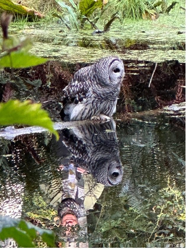 Our group was walking, reflectively, along a path that begins behind a circular building called Kiakum. Only moments into our hike, I felt the air rush through my hair, so close to my right ear, and I heard the soft “whoosh” of wings just a split second before I saw Her. Grace and power, landing lightly on a log in the middle of the still pond; a magnificent Barred Owl. She perched and craned Her neck to look around at us all; slowly blinking her soulful eyes, taking in the scene, intensely looking at each of us – as if to say “Aah, I see you’ve arrived….”.