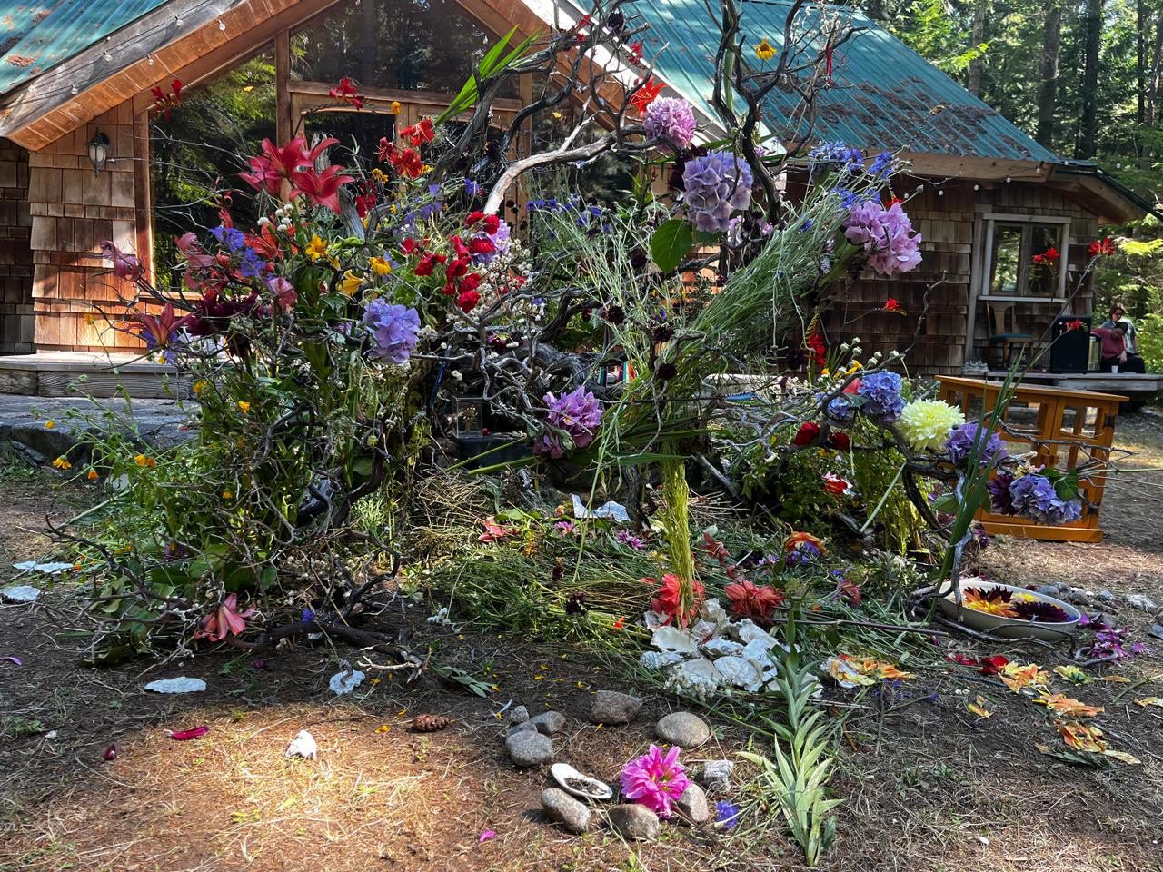 On the last day, I returned to the flower portal we had built together. Crawling into it like a womb, I lay down amidst blossoms and branches, tears streaming down my face. That’s when the hummingbird came. She hovered above me, emerald chest glinting in the light, drinking from the ruby red flowers we had woven in days before. Then she landed right above my head and watched me. She appeared calm, curious, and wise. “Alive to the edge of her skin,” as Rev. Angel Kyodo Williams urged us to be. I watched her, my teacher, open to whatever message she had for me, and felt calm and awe and gratitude grow in my heart.