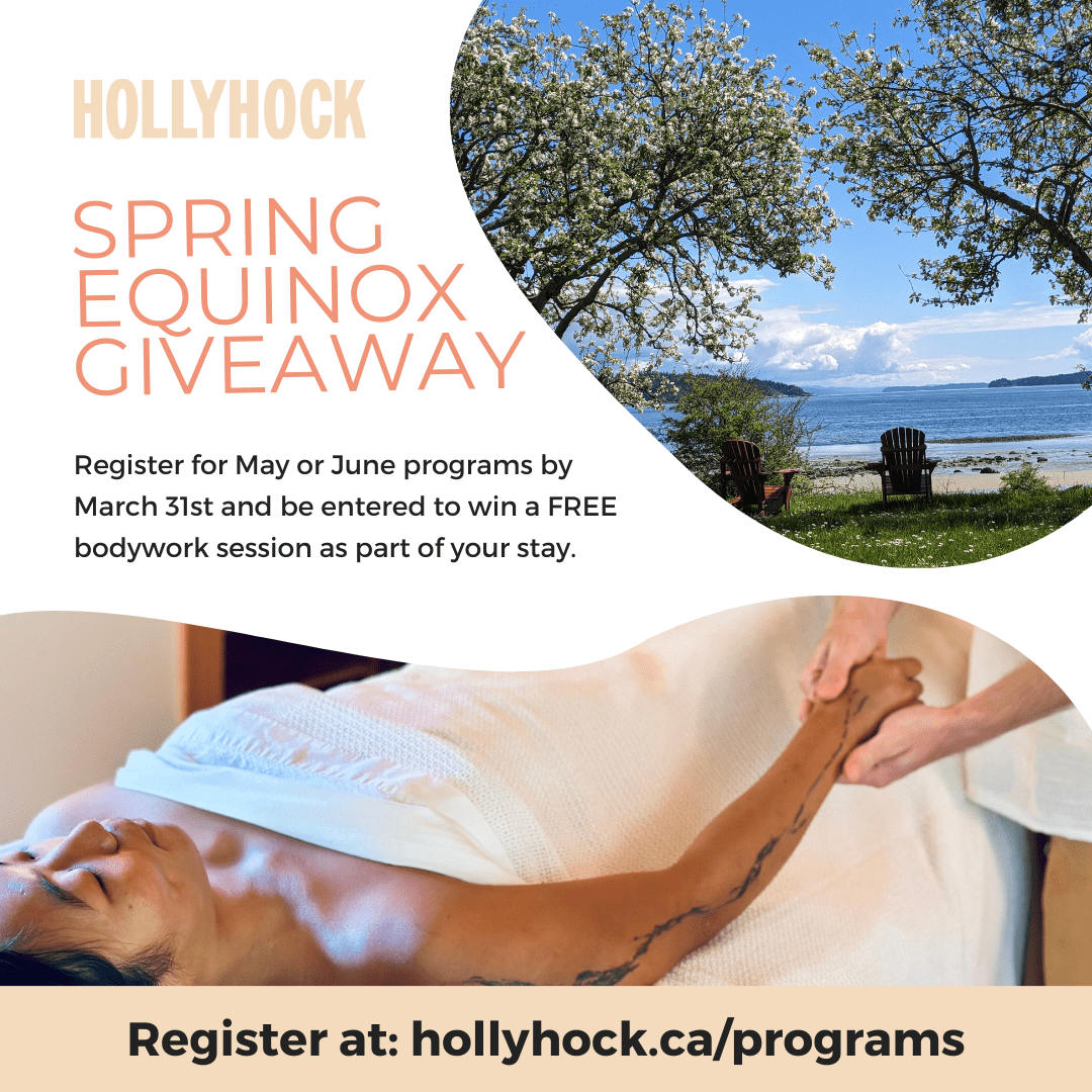 To celebrate the changing of the season register for May or June programs by March 31st and be entered into Hollyhock’s Spring Equinox giveaway! You could be one of 5 winners to receive a FREE bodywork session as part of your stay.