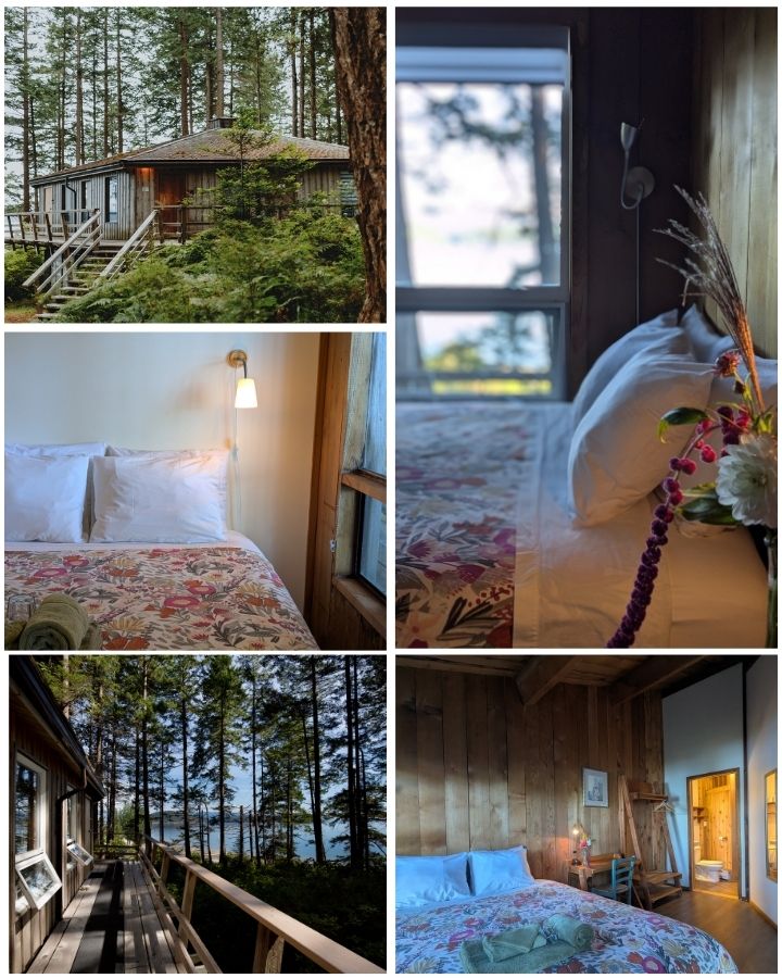This cozy cabin features a queen bed, a comfortable sitting area, a kitchenette, a private bathroom, and a sunlit deck overlooking the expanse of Desolation Sound. Peaceful and secluded, it’s a haven for rest, reflection, and connection with the natural world.