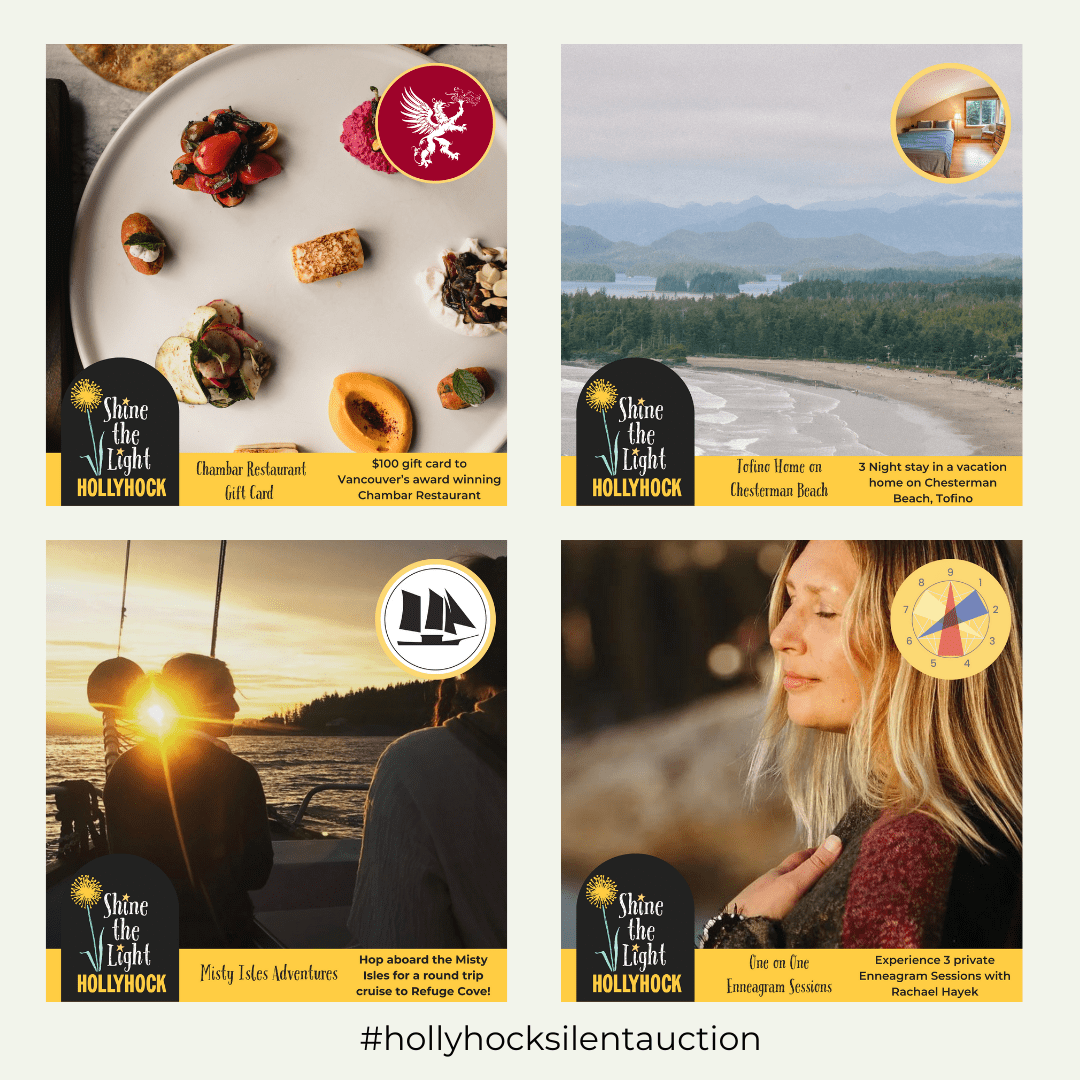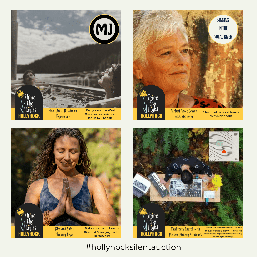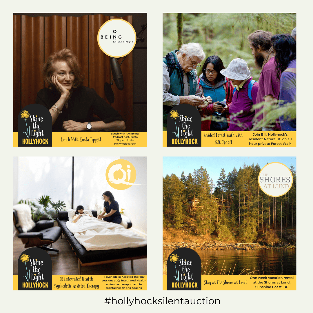 The silent auction offerings have been generously donated by Hollyhock community members and partners who understand the value of our work. Give them some love by visiting their websites, following their social accounts, and recognizing their contribution to our auction and community.