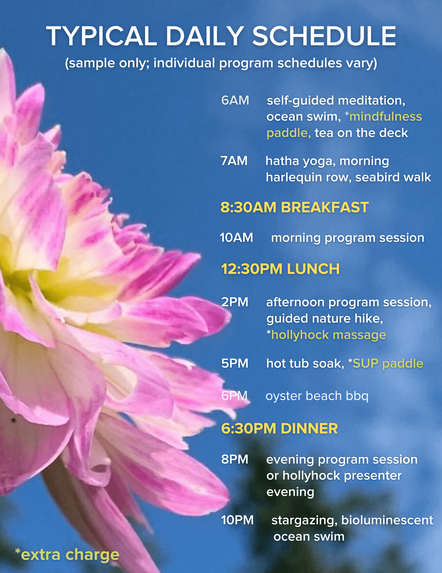 Thank you to the Hollyhock land, ocean, shores, garden & forest and all who tend them, human and more-than, now, in the future and before colonial time. We honour and give thanks to the Klahoose (ƛohos), Tla’amin and Homalco Nations on whose unceded lands we gather.